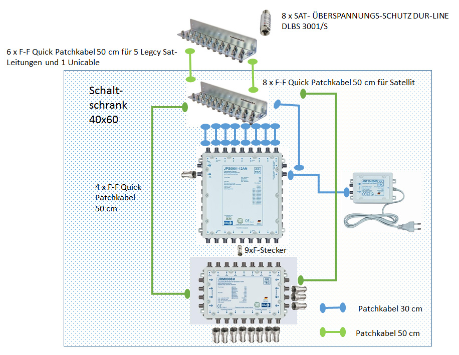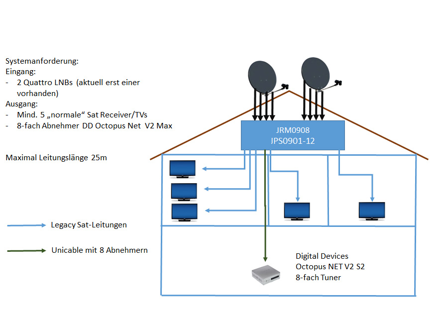 2x Quattro-LNB an die Antennen ...... dann 1x Unicable-/JESS-Multischalter ( Was ist JESS (Jultec Enhanced Stacking System/DIN EN 50607)? ) wie z.B. Jultec JPS0901-12AN und dahinter dann ein Standard-Legacy-Multischalter wie z.B. Jultec JRM0908T.mum97 hat geschrieben:2 Sat-Antennen --> Multiswitch (welcher?) ---> mind. 5 Abnehmer/Tuner via separaten Sat Leitungen und 8 Abnehmer an einem Unicable-Kabelstrang (DD Octopus Net V2 Max) ....