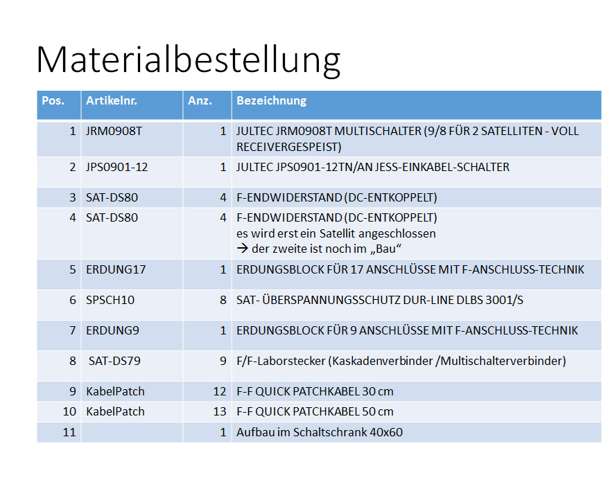 (Ich werde bei der finalen Bestellung noch zusätzliche Patchkabel und F-Stecker als Reserve ordern - hier geht es mir aber erst einmal um den Materialbedarf für das "Projekt")