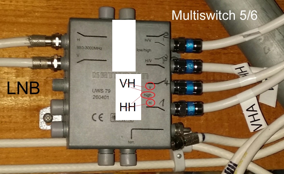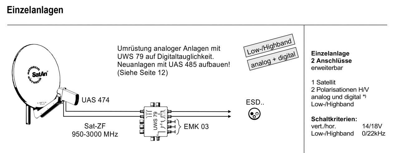 Sobald man aber das Highband empfangen will, braucht man den UWS 79, da vom LNB die beiden Polarisationen jeweils im Frequenzbereich 950-3000 MHz übertragen werden (Low-/Highband durchgehend von 10,7-12,75 Ghz). Die Bandtrennung geschieht dann im UWS. Die H/V-Umschaltung ist für Vertikal 0 V, Horizontal 16-19 V anstelle der üblichen 13/18 Volt.
