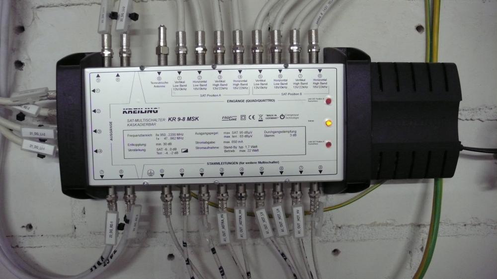Ja, das würde gehen ..... aber eben sehr teuer und auch mit 4 Ausgängen obwohl sie ja eigentlich nur 2 für sich selbst da benötigten würden. Netzteil müsste man keines einsetzen, die LNB-Spannungsversorgung (für welche das Netzteil ja ausschließlich da ist da der Schalter selbst voll receivergespeist ist !) wird von den bereits vorhandenen Multischaltern übernommen.BuGo hat geschrieben:b) vor oder nach dem ersten Kreiling-Kaskadenschalter einen JPS0904-3A zusätzlich einbauen (mit oder ohne Netzteil?) und unsere beiden Abgänge dort anschließen - und der Rest kann so bleiben und funktioniert dann auch uneingeschränkt weiter?
