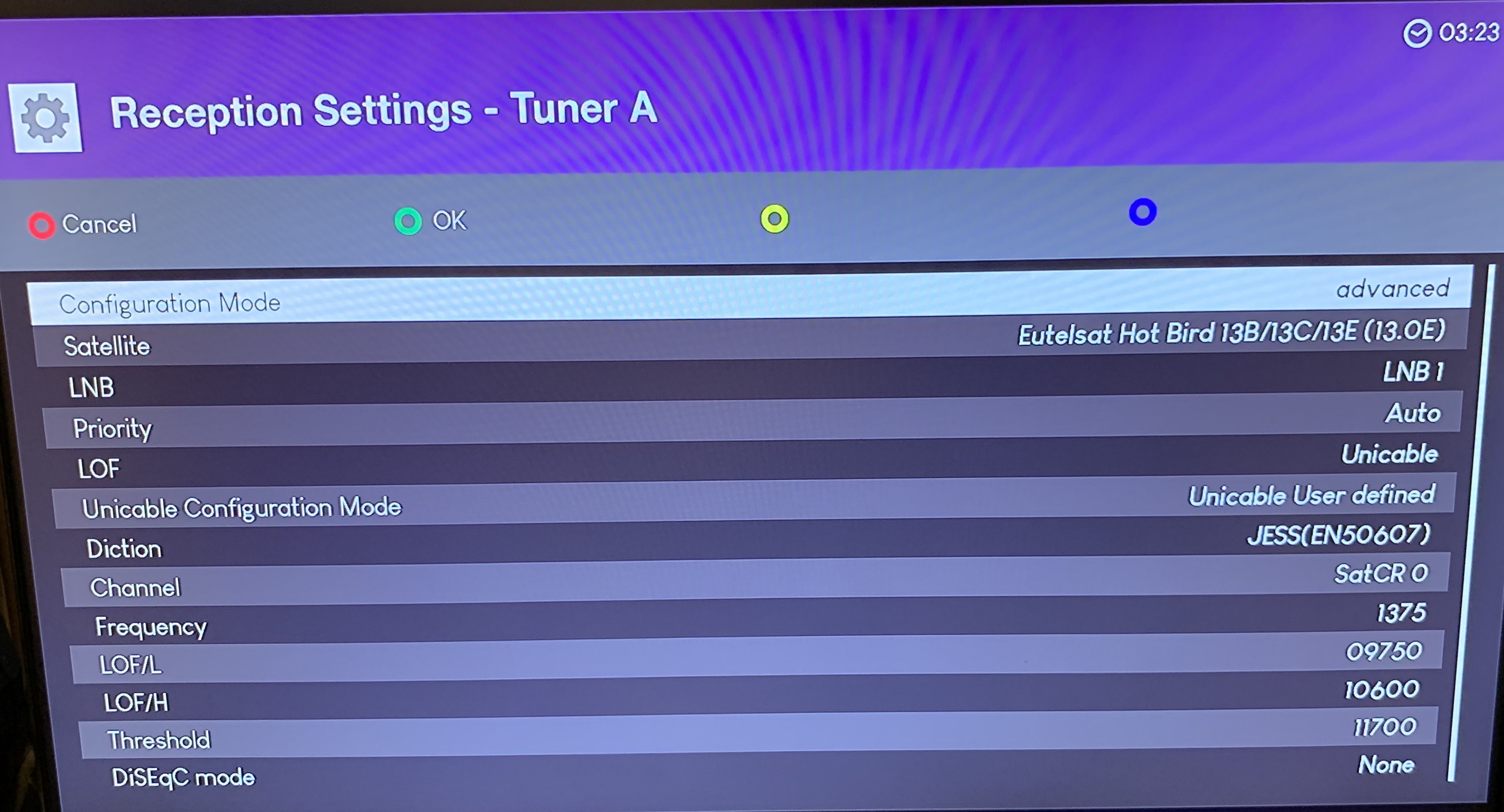 1. Tuner-Einstellungen stimmen jetzt (wenn nicht noch andere Sachen dort im Antennenmenu eingestellt sind, z.B. nicht noch ein anderer Satellit dort z.b. auf "Universal-LNB/Legacy" konfiguriert ist was dann alles in der Unicable-Programmierung stören würde - es darf NUR der Hotbird konfiguriert sein in diesem Test-Aufbau, sonst KEIN anderer Satellit)!