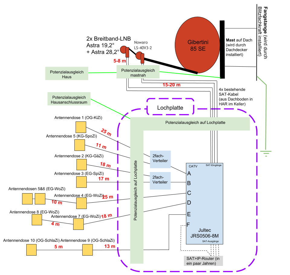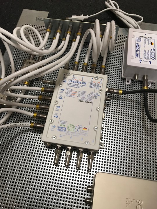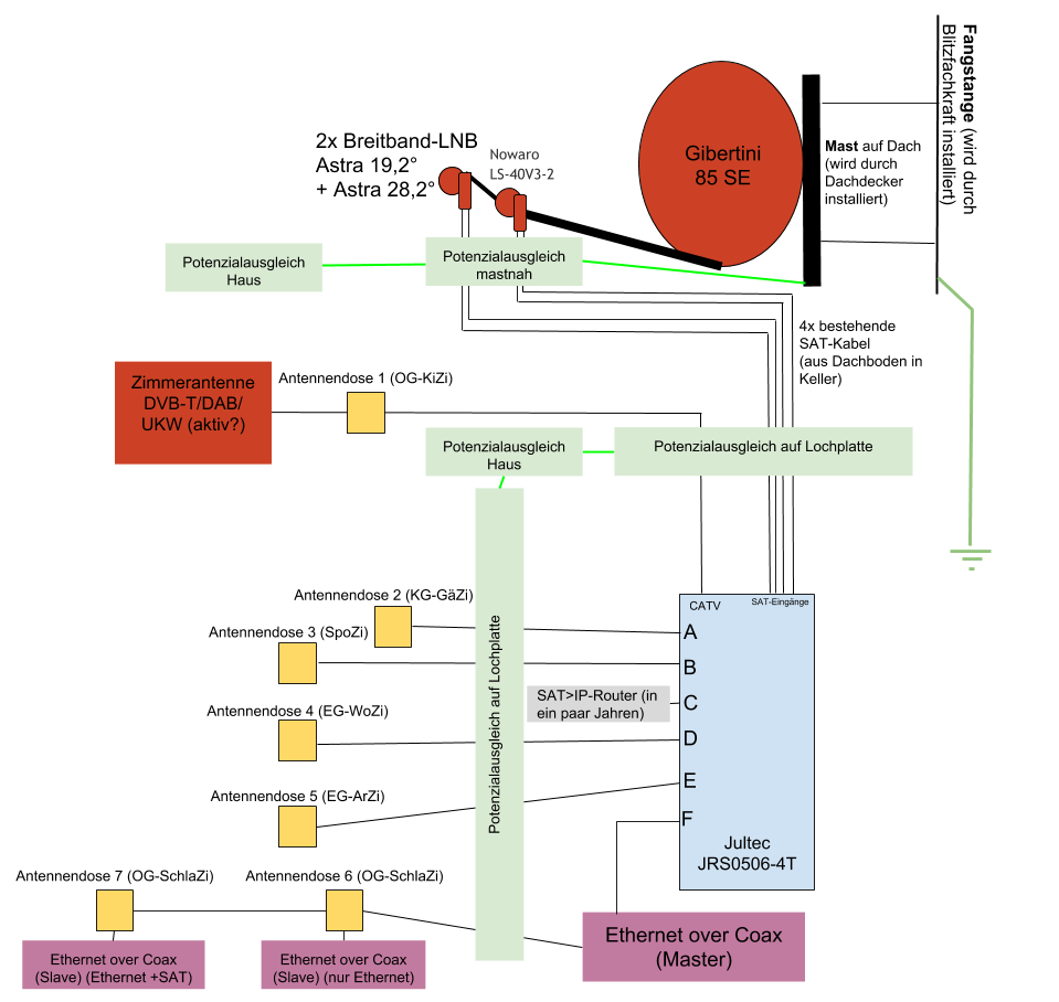 - Perspektivisch möchte ich in einigen Jahren vielleicht einen SAT>IP-Router installieren. Dieser könnte entweder an einen der Ausgänge des Einkabelschalters gehängt werden, oder eventuell an die Stammleitungen. So es denn irgenwann SAT>IP-Router gibt, die mit Breitband-LNBs umgehen können.