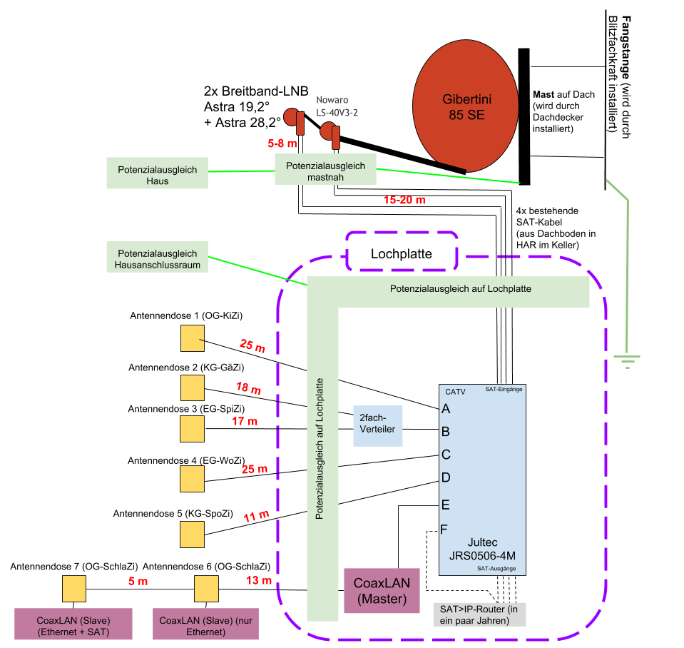 - Gewünscht sind nun 2 Satellitenpositionen (Astra 19,2° und 28,2°), daher die Multifeedhalterung. Da sich keine neuen Kabel einziehen lassen, werden die vier bestehenden Kabel vom Dachboden in den Hausanschlussraum im Keller mit zwei Breitband-LNBs genutzt.