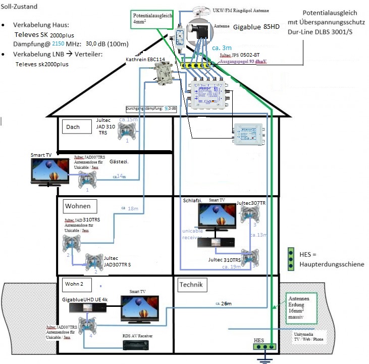 Das Bild hatten sie aus dem Beitrag unter Umbau EFH von Kabel Unitymedia auf Sat Unicable/Jess , das stellt aber in vielen Punkten eine absolute Spezial-Anwendung dar und dort wurde z.B. beim Verteiler schon einer gewählt der da nicht zu 100% rein passt, ist aber in dem Beitrag auch erklärt.RS2 hat geschrieben:Die Anordnung im Haus habe ich mir wie im Bild gezeigt aus einem Ihrer Beiträge abgeschaut und für meine Zwecke umgestaltet.Einfamielienhaus SAT Verkabelung.jpg
