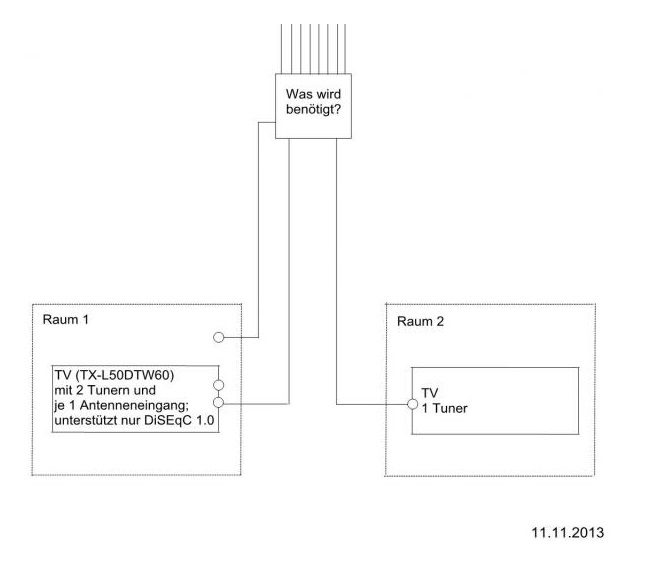 Zu 2. "Multischalter" ist nur ein von mir aus der technischen Hilfslosigkeit heraus geborener Ausdruck, muss also überhaupt nicht sein. Funktionabel und trotzdem preisgünstiger ist besser. - Gegenwärtig wird nur der TV in Raum 1 (siehe Skizze) genutzt. Der Anschluss in Raum 2 soll aber schon demnächst auch genutzt werden, wird also gebraucht.