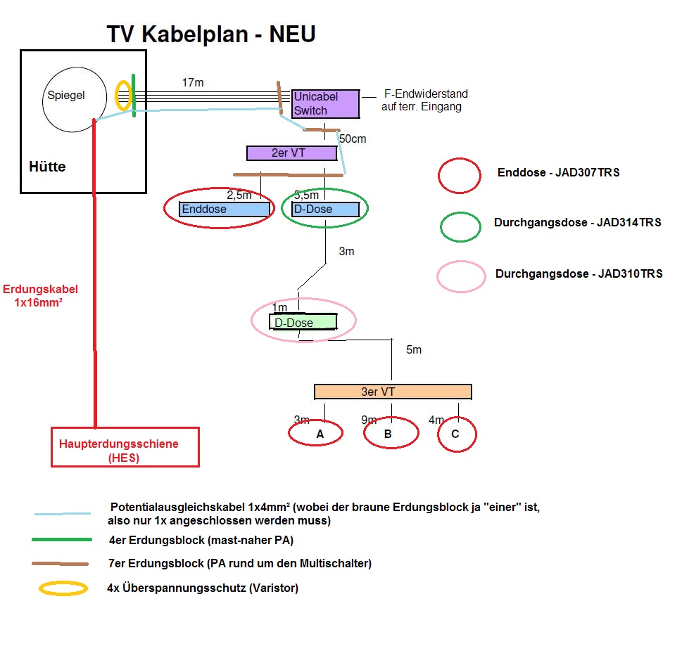 Für meine komplette Planung brauche ich im Plan noch Angaben wo eine "Twin-Versorgung" (Einsatz eines Twin-Receivers dort möglich das man eine Aufnahme durchführen kann und parallel etwas anderes anschauen kann) überall benötigt wird, vor allem der gewünschten Einsatz-Typ der Antennendose die in blau mit "Enddose" beschriftet ist !! Wenn diese nur eine Single-Versorgung benötigt dann kann man diesen Anschluss ganz weg vom "Unicable" über den Legacy-Ausgang eines Unicable-Multischalters versorgen ....Emailanfrage hat geschrieben:Ich habe ihnen mal eine recht einfache Skizzierung angehängt auf der grob zu erkennen ist, was wie verkabelt werden sollte.