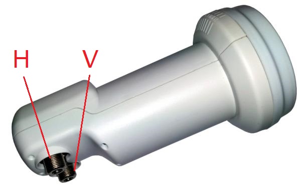 Ausgänge V/H von hinten gesehen: links = vertikal / rechts = horizontal (keine Beschriftung am LNB ! Siehe auch Bild in der Anlage hier beim Artikel)