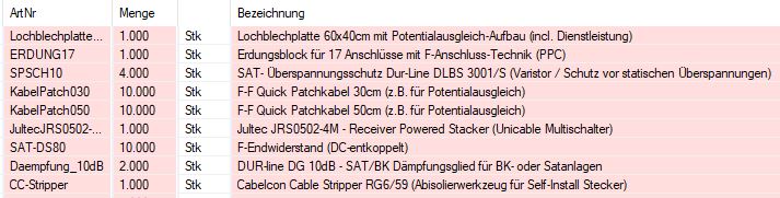 Sie haben recht da stimmt was nicht. Wenn ich mit allen Ausgängen der Multischalter auf den Erdungsblock gehe komme ich auf 22 Patchkabel und somit bin ich gerade darauf gekommen dass es sich nicht ausgeht mit allen Ausgängen auf den Erdungsblock zu gehen, weil ich dann 18 Anschlüsse am Erdungsblock benötigen würde. Somit würde ich Ihr Auflistung übernehmen und nicht mit allen zum Erdungsblock gehen.techno-com hat geschrieben:Die Gesamtanzahl muss 20 sein ....