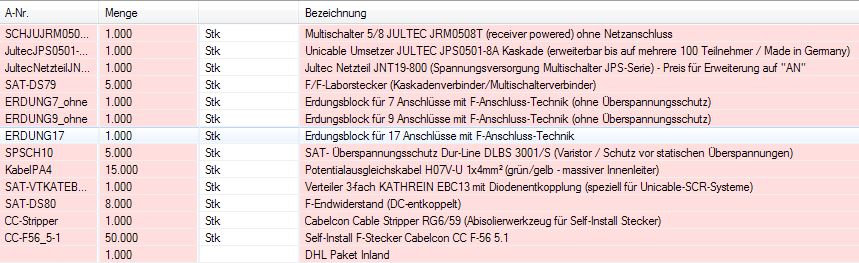 Darüber hinaus würde nur noch der Installations-Kleinkram anfallen (Selfinstall-F-Stecker für die ganzen Verbindungskabel, ein paar DC-entkoppelte Endwiderstände für die offenen JPS-Ports und fünf F/F-Laborstecker für die MS-Kaskadierung plus zwei Erdungsblöcke 9 und 17).
