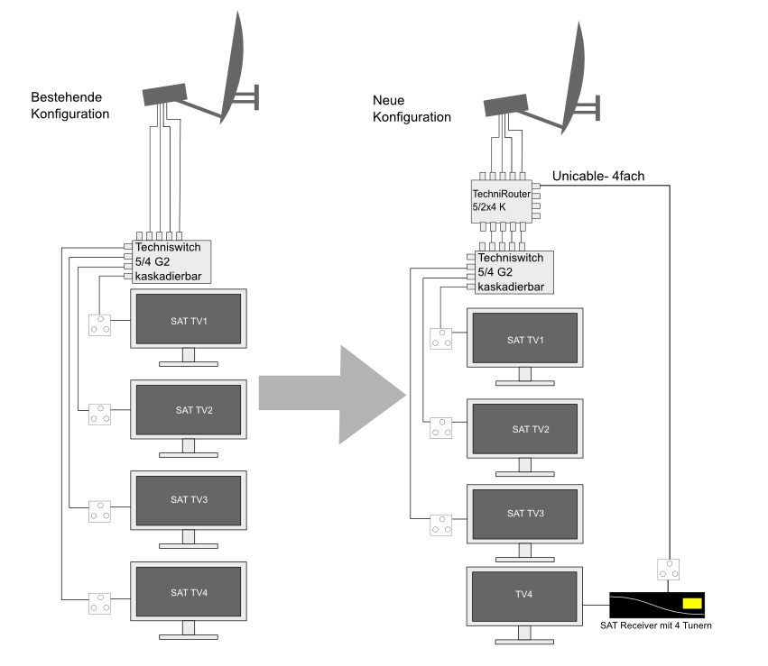 Da keine neuen Kabel verlegt werden können, habe ich mich entschlossen die Anlage mit einer Unicable Konfiguration zu erweitern.