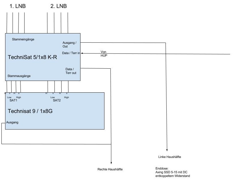 Zur Anlage, kurz gehalten zuerst einmal .....Ruttkowa hat geschrieben:Zunächst einmal ist hier ein schematischer Aufbau unserer SAT Anlage (allerdings ohne Gewähr, wurde von mir nach bestem Gewissen erstellt, bin dafür auf dem Speicher rumgekrabbelt ;) ). Wie oben geschrieben, befinde ich mich im EG, also an letzter Stelle in der linken Haushälfte.
