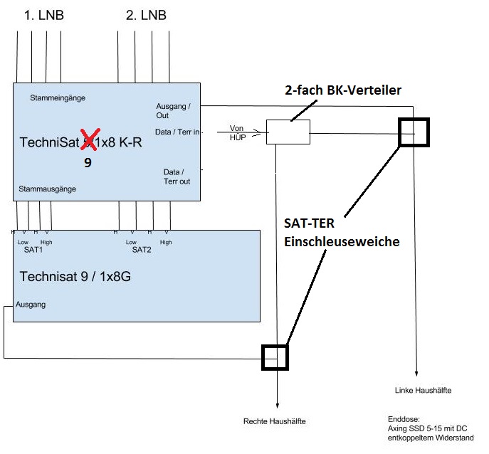 Mittlerweile habe ich mir selbst die Axing SSD 5-15 verbaut (inkl. 75 Ohm DC entkoppeltem Widerstand) und würde das ganze gerne nochmal versuchen - allerdings will ich vorher eben alle Eventualitäten abklären. TV (bzw. Sky) wird immer noch über den TV-Ausgang der Axing Dose genutzt.