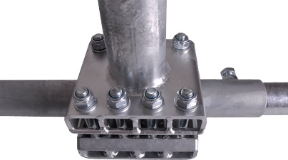 8 Schrauben pressen 10 Zahn kombinationen gegen das Halterohr. Dadurch entsteht eine kraftschlüssige Verbindung. Diese reicht für Spiegel bis 130 cm Durchmesser.