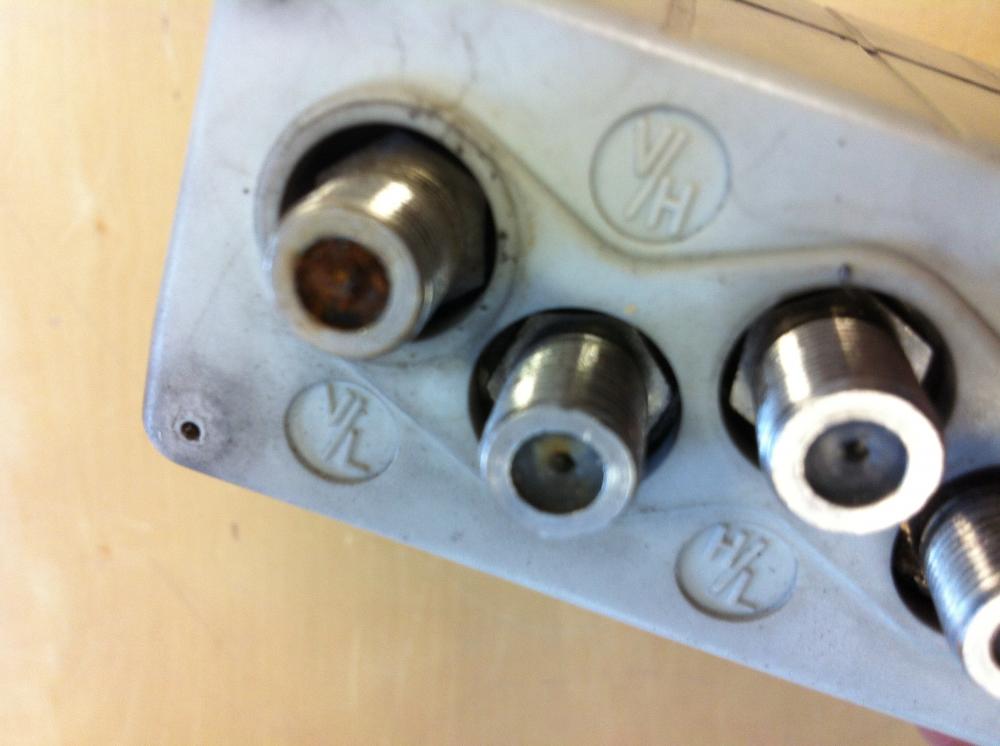 Über den Eingang VL kam Wasser in das LNB, gut zu erkennen an dem verrosteten Eingang. Hier war ein Stecker falsch montiert durch den Wasser eindringen konnte (möglich wäre z.B. auch eine defekte Feed-Kappe die z.B. schlecht verklebt wurde oder ein aufgerissenes Innengehäuse vom LNB selbst).