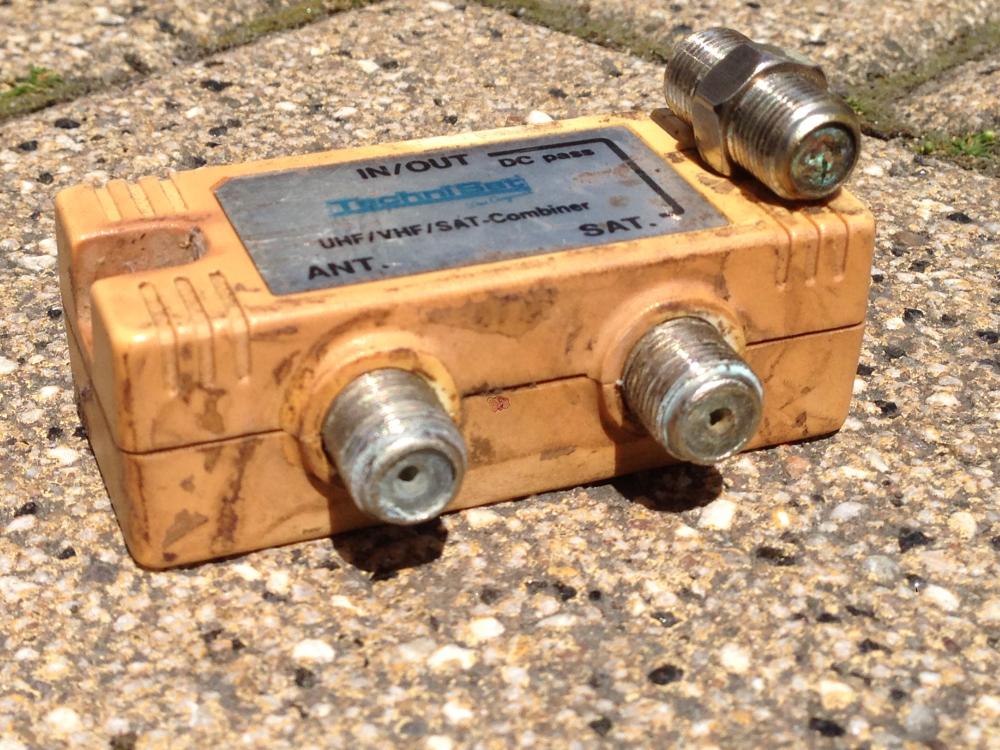 Hier noch 2 Beispiele, eine SAT-TER Einschleuseweiche und ein F-Verbinder die mit einem Stahlkabel (CCS) angeschlossen waren. Beide total durchgerostet, im F-Verbinder hängt noch der verrostete Innenleiter vom Koaxkabel drin.