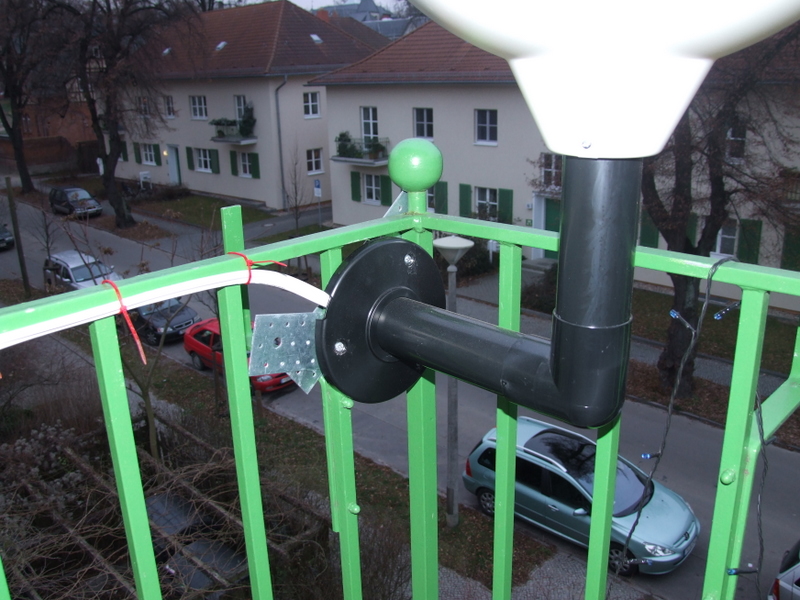 In den Weihnachtsferien werde ich dies zu durch zwei breite L-Stücke mit genau gebohrten Bohrungen ersetzen. Davor zwei lange Blumenkästen zur Tarnung der Halterung. Aufgrund der Informationen im Internet habe ich mich gegen eine Fassadenhalterung in einer Mietwohnung entschieden - so müßte sie als normale Nutzung eines Balkons gelten...