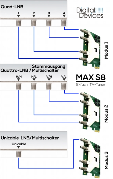 Bei Nutzung eines Quattro-LNBs oder des Stammausgangs eines Multischalters, ist der Betriebsmodus "Quattro" für einen Satelliten wählbar. (Beide Betriebsarten benötigen für 8 Tuner nur 4 Kabel, dank integriertem Multischalter)