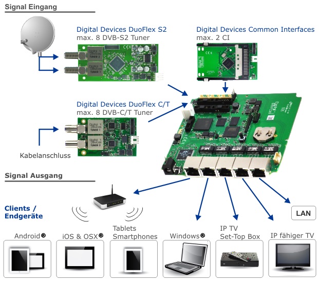 Die Octopus Net streamt LiveTV auf IPTV fähige Endgeräte im lokalen Netzwerk. Sie macht so aus zahlreichen Endgerät einen Full HD (*¹) Fernseher für Satelliten- und Kabelfernsehen. Dabei werden die frei empfangbaren Sender in Full HD per LAN und/oder WLAN im lokalen Netzwerk verteilt. Die bis zu 8 Streams - je nach Ausbaustufe - können dabei zeitgleich an stationären und mobilen Endgeräten genutzt werden. Die zu nutzende Clientsoftware (*²) ist dabei für die Betriebssysteme iOS (iPhone, iPad), Android, MAC OS sowie Windows bereits von verschiedenen Herstellern am Markt verfügbar (Smart TV Fernseher, Windows Phone, Windows RT und Kindle Fire HD in Vorbereitung).