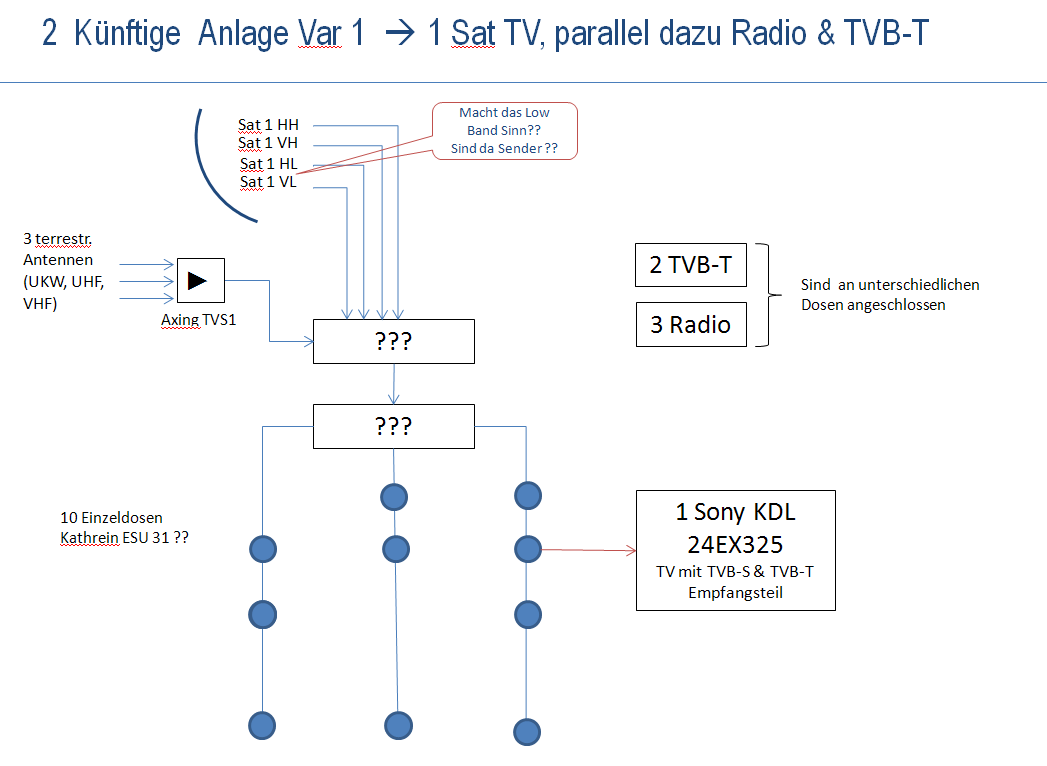 P.S. Beiliegend 3 Folien mit Status quo (1), Minimallösung (2) mit einem Sat TV ohne allen SchnickSchnack, komfortablere Lösung (3) mit 2 Receivern.