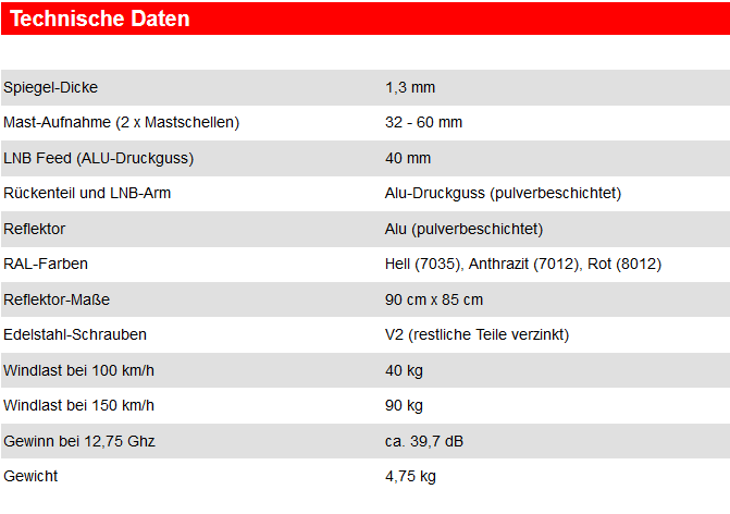 Nur die besten Materialien wurden hier verwendet. Das Rückenteil und der LNB-Arm sind aus pulverbeschichtetem Aluminium Druckguss hergestellt. Der LNB-Halter ist ebenfalls aus Aluminium-Druckguss gefertigt. Auch der Reflektor besteht aus hochwertigem Aluminium. Die Schrauben sind entweder aus Edelstahl V2 oder wie die restlichen Teile verzinkt.