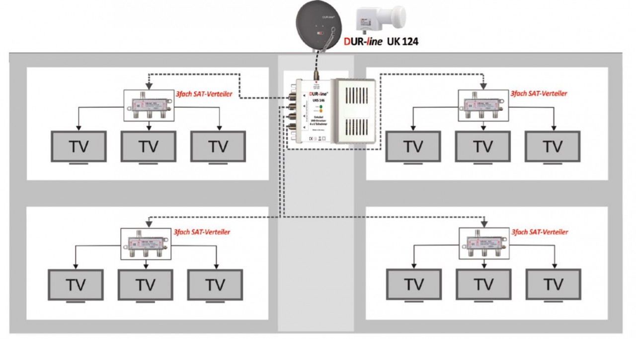 Reduzieren Sie jetzt mit dem DUR-line UKS 146 Set den Verkabelungsaufwand und damit die Installationskosten Ihrer Satellitenanlage auf ein Minimum.