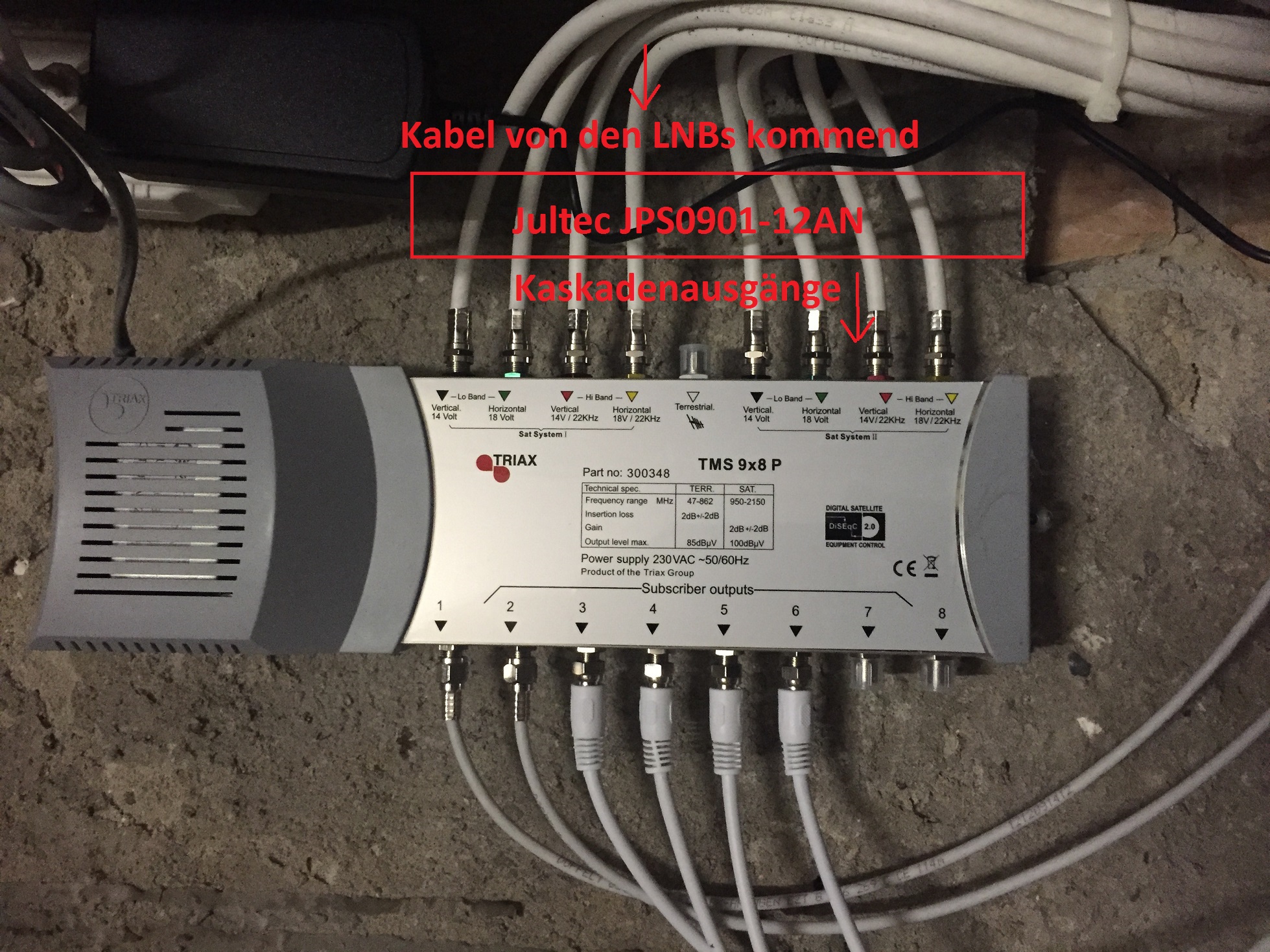 Gestern hatte ich endlich mal Zeit den JESS-Multischalter an die bestehende Anlage einzubinden. Erstens, ich bin begeistert über die Vormontage des Multischalter, Preis/Leistung unschlagbar, sehr saubere Arbeit.