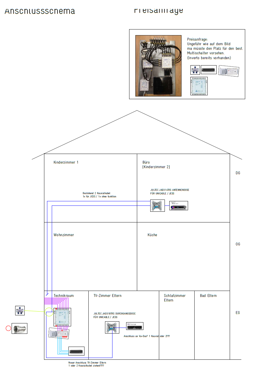 Da wir nur im EG neue SAT-Kabel ziehen können, dachte ich mir, dass wir im EG eine VU+ Solo 4K als Serverbox betreiben können, die zweite im OG und eventuell eine dritte im DG Kinderzimmer 1 als Clientbox. Daher der Gedanke die Anlage mit einen JESS-Multischalter zu erweitern. Ehrlich gesagt weiss ich nicht, ob das die beste Lösung ist. Was würden sie mir Empfehlen?
