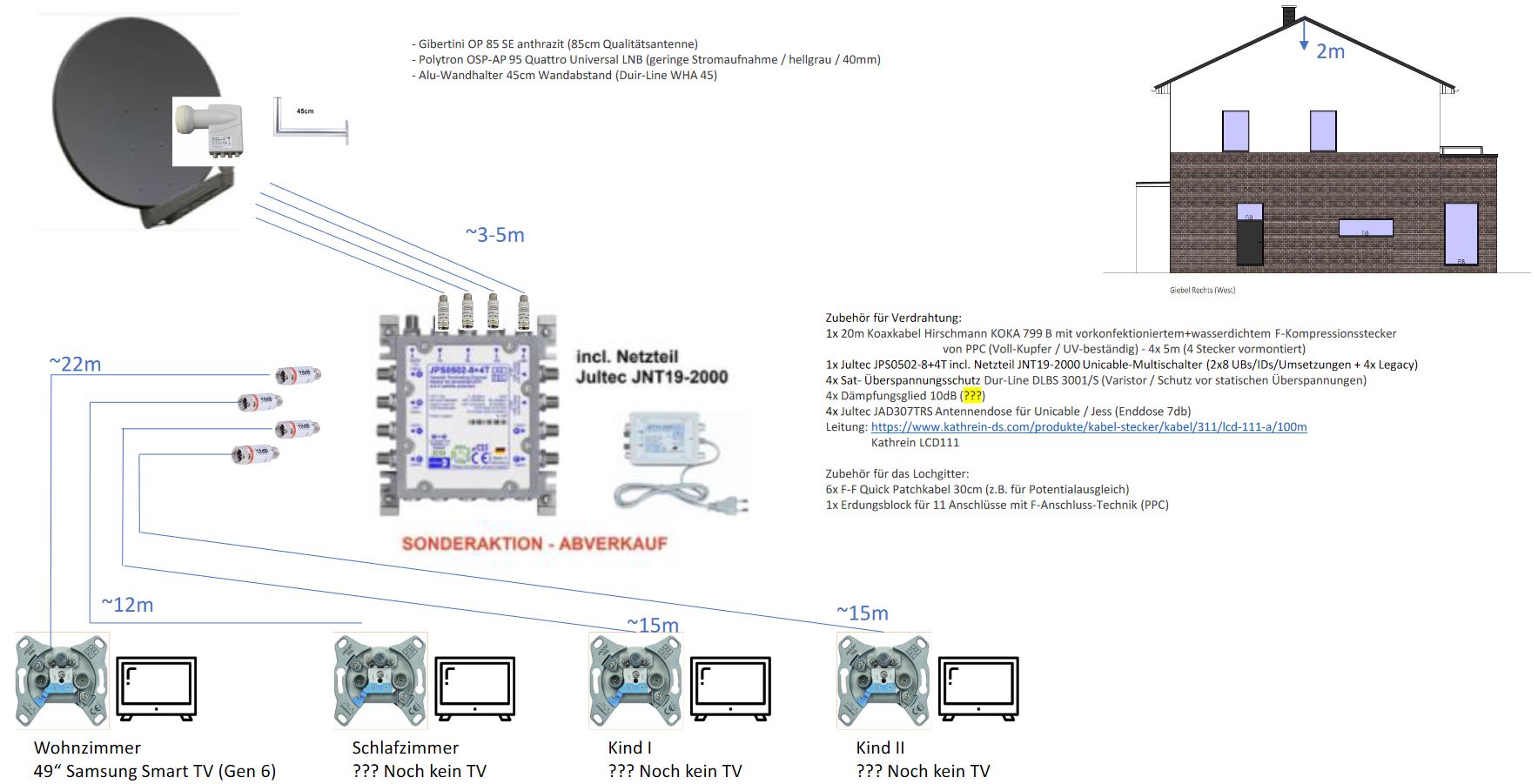 Hier alles OK .. ABER ! Wie verlaufen die Kabel vom LNB dann bis zum Multischalter und wohin wird der Multischalter installiert (auf dem Dachboden oder im Keller/Technikraum ?).