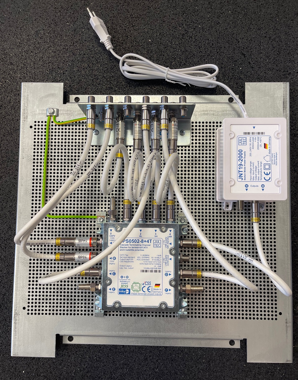 Und dann werden 9 Patchkabel benötigt ... 4x für die Kabel vom Quattro-LNB kommend + 4x für ihre Ausgänge und dann noch 1x für den Anschluss vom Netzteil
