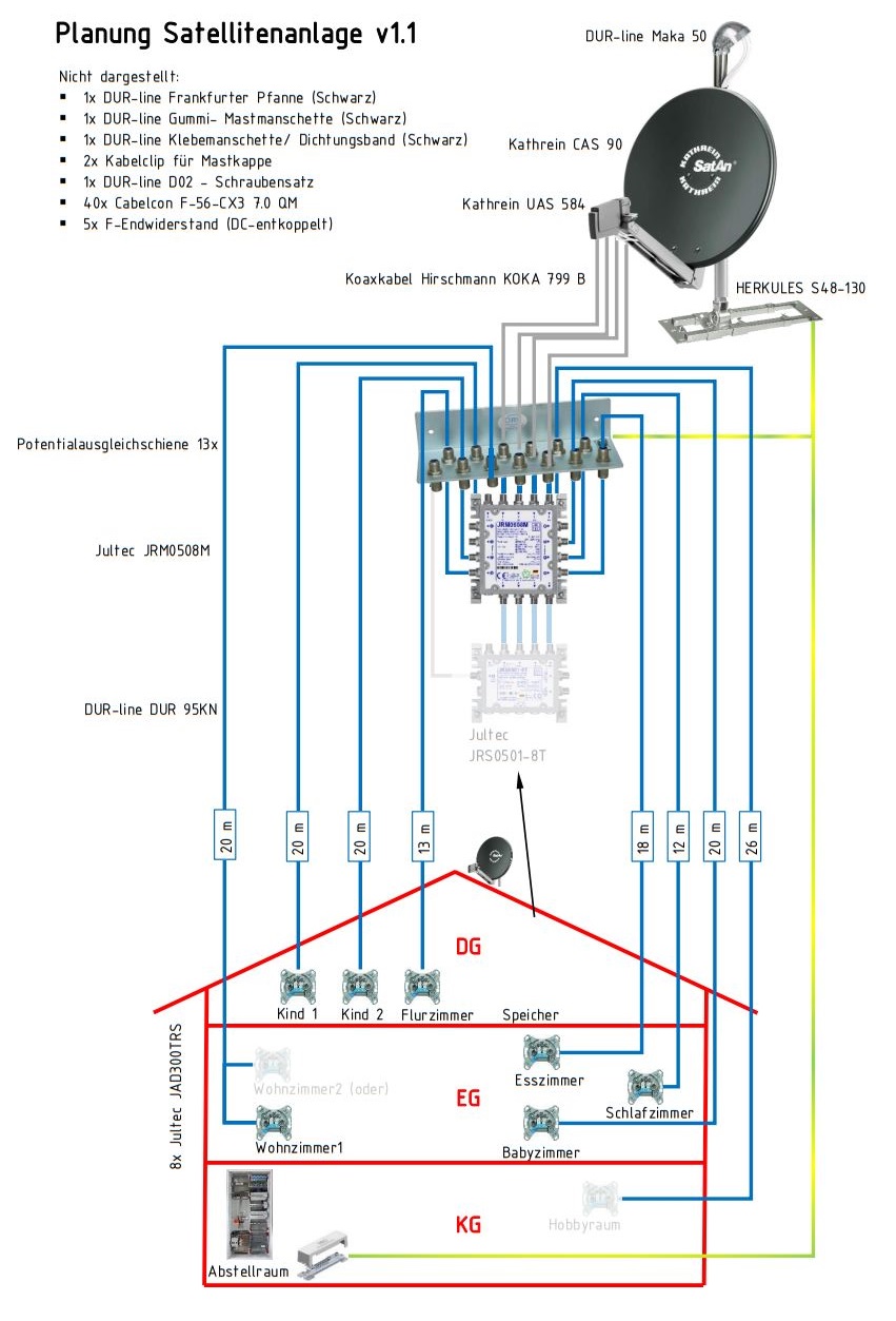 Ich habe mir jetzt überlegt, dass ich mit dem Jultec JRM0508M starte und dann später den Jultec JRS0501-8T nachrüsten kann (daher ist dieser gräulich dargestellt). Montage von Potentialausgleich und Multischalter werde ich im DG Speicherraum machen (auch wenn die Hauptverteilung im Keller "Abstellraum" ist). Verkabelung Sternförmig an jede Dose vom DG Speicherraum.
