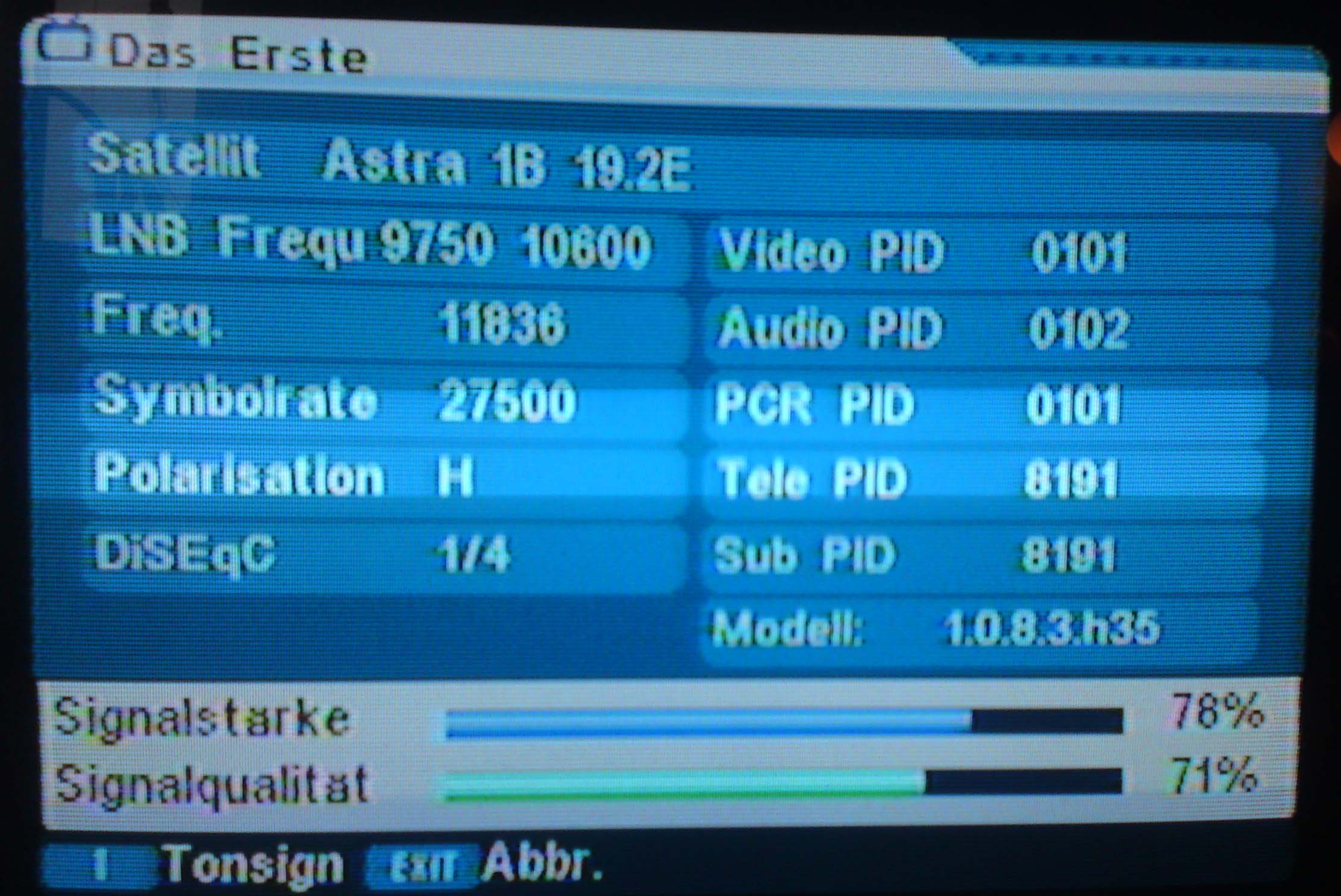 Habe denke ich auch die richtige Richtung denn der Sat Receiver zeigt bei ARD (Programm1) Signalstärke 78% und Signalqualität 71% an aber ich habe keinen Bild und kein Ton auf den Programmen. Er zeigt nicht an Signal fehlt sondern bleibt schwarz. Weiter hinten, ab ca. Programmplatz 200 bekomme ich Sender aber davon ist nicht einet deutsch...