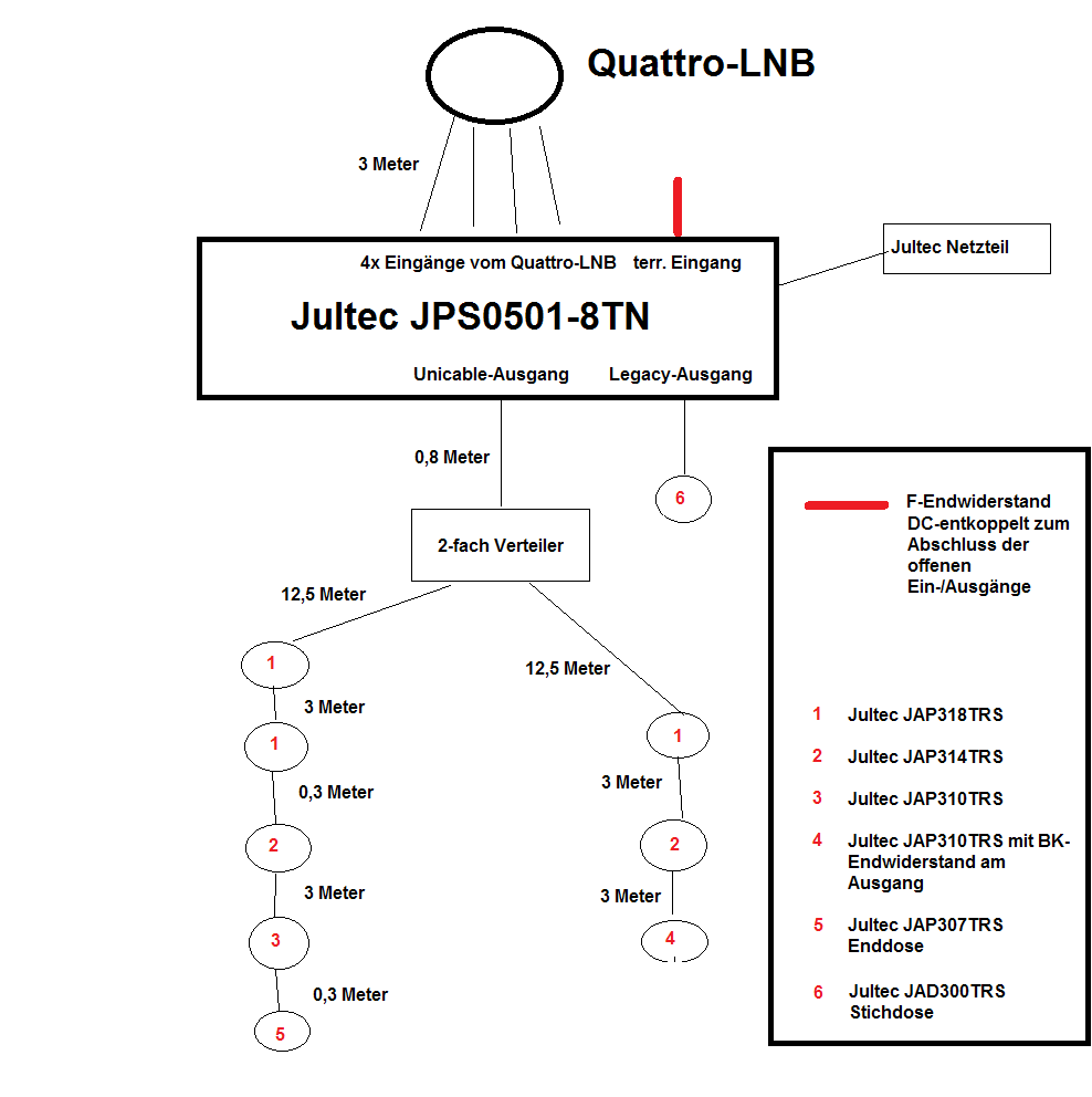 Wird nicht benötigt bei diesen doch wirklich nur sehr kurzen Kabelwegen ! Aber das Kabel, wenn doch absolut nicht tauglich, kann da auch immer einen Strich durch die Rechnung machen. Versuchen würde ich es aber immer erst einmal ohne einen Verstärker.Belushi55 hat geschrieben:Letzte Frage: bei der Anlage von Smart wurde ein Einschleussverstärker benutzt. Gibt es so etwas auch für die Jultec, falls das Signal an den Dosen zu schwach sein sollte ?