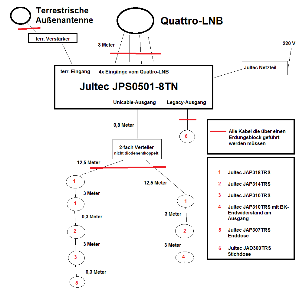 Auch das habe ich jetzt noch einmal in ein Bild gefasst, incl. der terrestrischen Einspeisung die sie ja wohl weiterhin mit verwenden möchten (dazu übrigens genau passend zu ihrem Vorhaben der o.g. Beitrag unter Umbau Kabelanlage auf Unicable der auch eine Unicable-Verteilung incl. einer terr. Einspeisung als Thema hat) und auch allen Kabeln die für den PA hergenommen werden müssen. Alles andere, viel mehr Details, bitte in den bereits verlinkten Beiträgen genau mal raus lesen - es lohnt sich die zu lesen für viel mehr Infos (z.B. "UV-beständige Kabel für den Außenbereich" bzw. "Stecker-Auswahl" etc. etc.) Der 2-fach Verteiler hier muss dann so einer sein => 2-fach Verteiler Sat-tauglichBelushi55 hat geschrieben:Wenn ich das richtig verstanden habe, brauche ich nun einen Erdungsblock, der mit dem blauen Kabel an den Mastfuß angeschlossen wird, wo 4 Sat-Kabel vom LNB und das UHF/FM-Kabel von Antenne draufgehen praktisch "durchgeschliffen" werden auf die Jultec Einkabelanlage, der Legacy-Ausgang wieder auf Erdungsblock "durchgeschliffen" zur Stichdose, der Einkabelausgang wieder auf Erdungsblock "durchgeschliffen" auf Zweierverteiler und von dem auf die zwei Stränge.