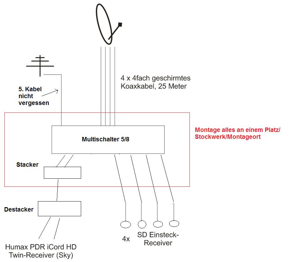 Ich sehe bei ihnen nicht unbedingt die Notwendigkeit eines "kompletten" Einkabelsystems. Sie möchten ja überhaupt nur einen Standort mit einem Twin-Receiver ausstatten !Waterjet hat geschrieben:Aus dem Verteilerraum gehen 5 vorhandene Koax-Kabel in einzelne Räume. In einem Raum soll der Twin-Receiver über ein Kabel angeschlossen werden und in den anderen Räumen würde ich gerne 4 Einsteckreceiver verwenden.