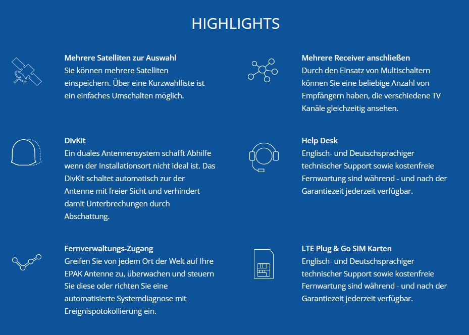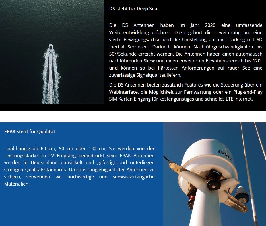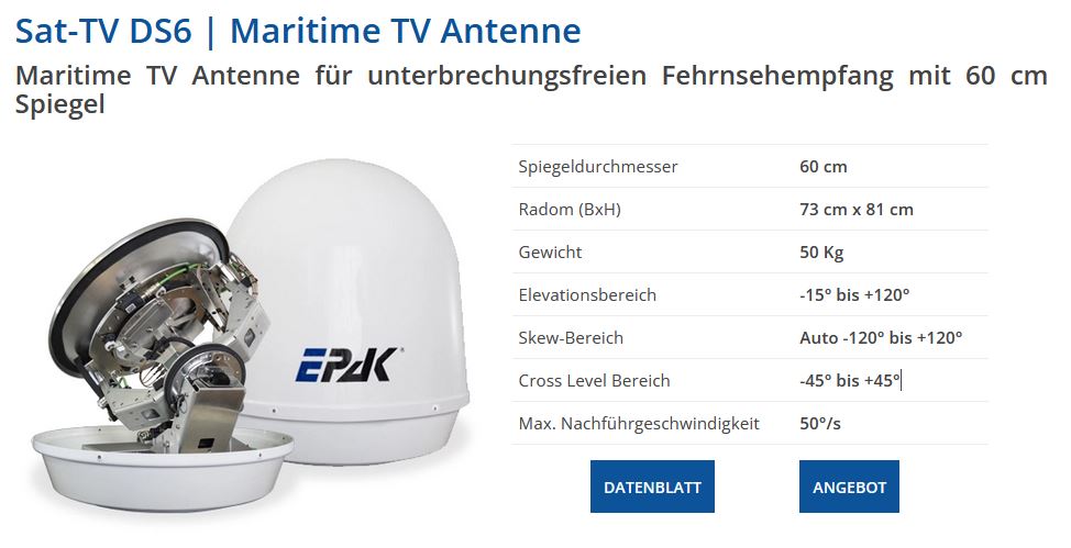 Satellitenfernsehantennen von EPAK verfolgen das Satellitensignal, während sich das Schiff im Wasser bewegt. Die vollautomatischen Systeme können auf allen Ku-Band-Diensten weltweit eingesetzt werden. Die TV Antennen von EPAK sind einfach zu installieren und zu bedienen und ermöglichen den Zugriff auf Tausende von Fernsehkanälen aus der ganzen Welt, beispielsweise über Hispasat, Astra, Thor, Nilesat oder Hotbird.