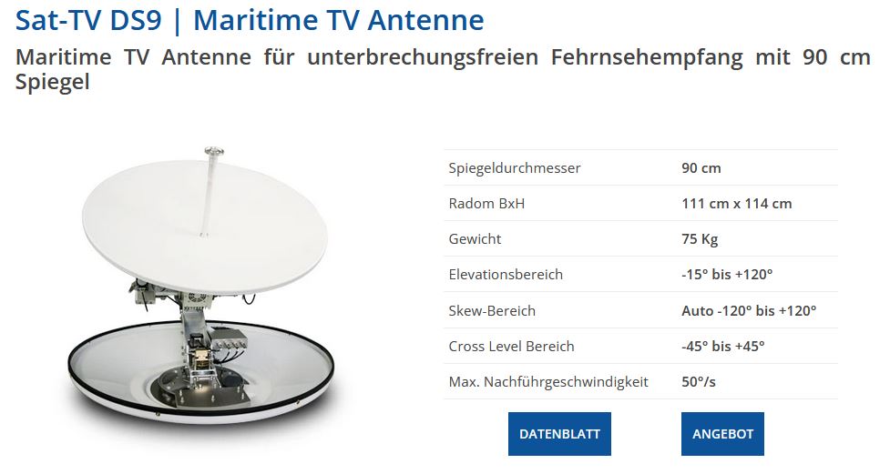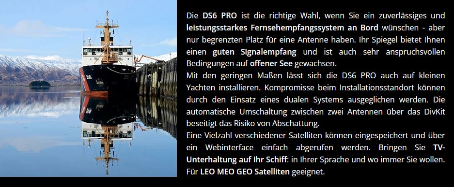 Die DS Antennen haben im Jahr 2020 eine umfassende Weiterentwicklung erfahren. Dazu gehört die Erweiterung um eine vierte Bewegungsachse und die Umstellung auf ein Tracking mit 6D Inertial Sensoren. Dadurch können Nachführgeschwindigkeiten bis 50°/Sekunde erreicht werden. Die Antennen haben einen automatisch nachführenden Skew und einen erweiterten Elevationsbereich bis 120° und können so bei härtesten Anforderungen auf rauer See eine zuverlässige Signalqualität liefern.