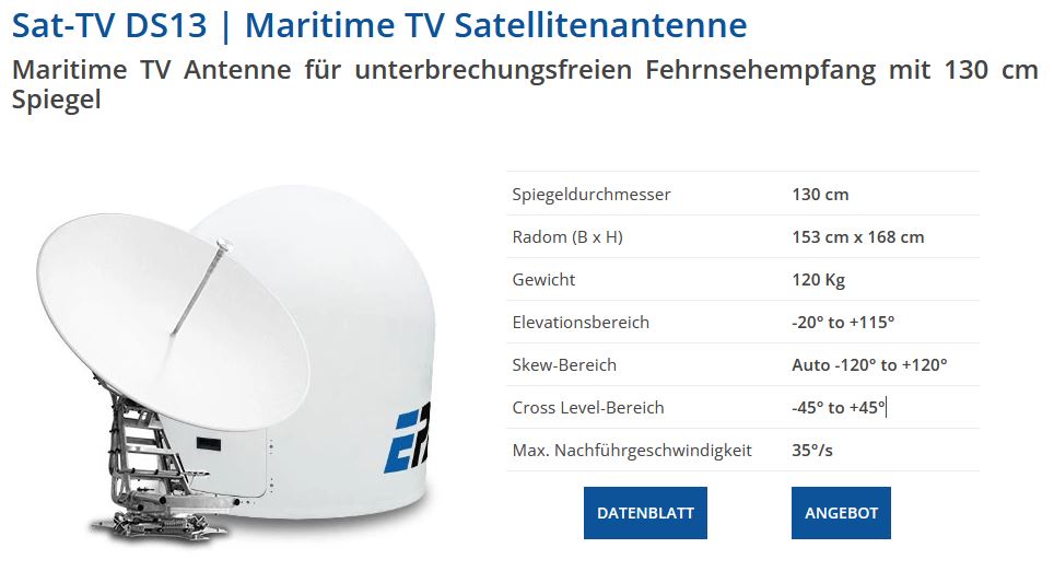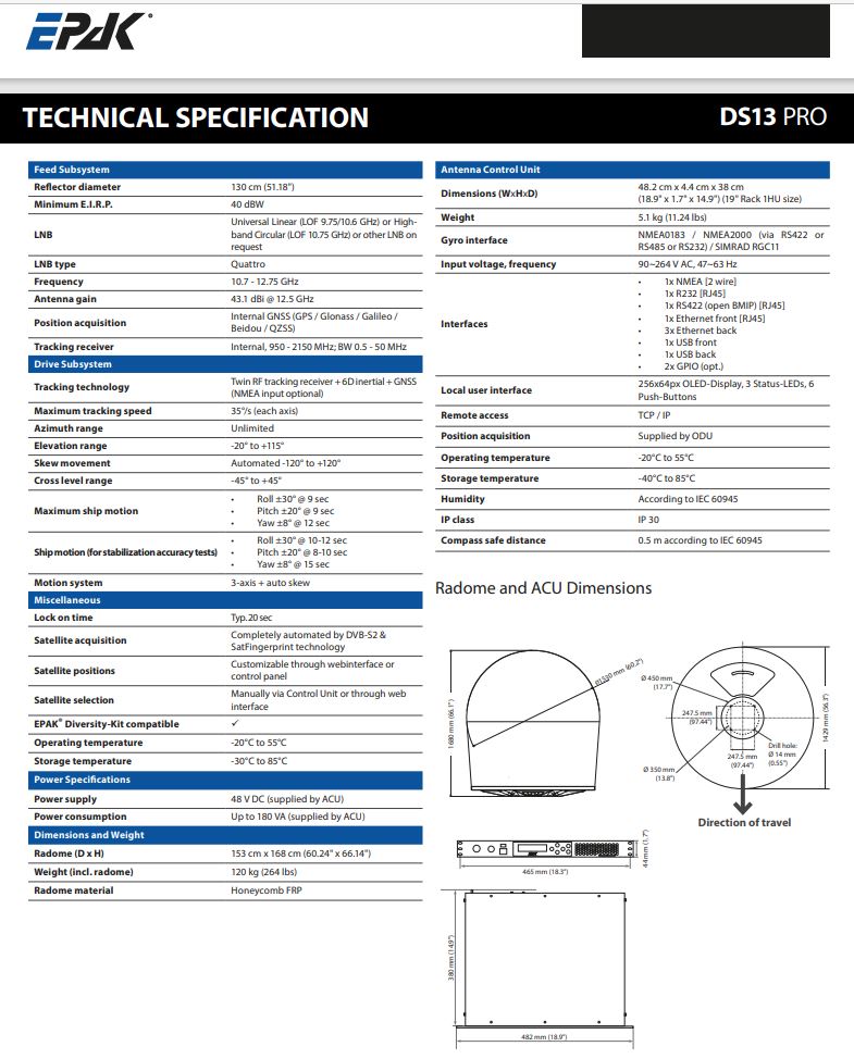 EPAK TVRO DS6 Pro / DS9 Pro / DS13 Pro mit Quattro-LNB - digitale 60/90/130cm Schiffsantenne (selbst ausrichtend und nachführend / Binnen-/See-/Meer-Schifffahrt)