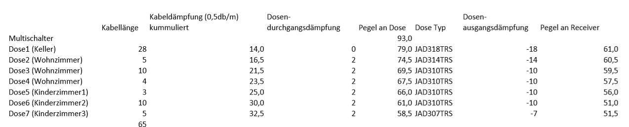 Und jetzt habe ich auch erst verstanden was sie da gezeichnet haben ... "kummulierte" Kabelwege/Dämpfungen und keine Einzelwerte zwischen den einzelnen Dosen ....mawa hat geschrieben:mein Fehler in der Berechnung war es, dass ich die Dämpfungen der Dosen nicht aufsummiert habe. Und mit der kummulierten Kabeldämpfung habe ich sie scheinbar verwirrt. Deswegen zur Klarstellung nochmal die korrigierte Fassung.