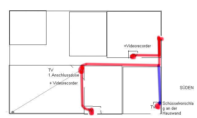 Astra1 19,2° reicht ja für Deutsche Sender völlig aus, wenn ich das richtig sehe. über die Seite http://www.dishpointer.com/ weiss ich das ich mir an der Hauswand die Schüssel befestigen werde und die Kable durch die Kellerwand bohre. Von dort mache ich in die 4 Zimmer durch die Betondecke Bohrungen damit ich dort die Kabel hochziehen kann. Meine Zimmer liegen so wie in der Anlage hier zum Beitrag. (Bild vom Admin hier ins Forum direkt eingestellt)