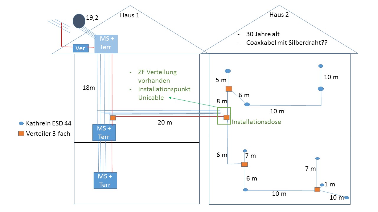 ich bin bei der Suche nach Unikabel auf dieses Forum gestoßen und bitte daher um Hilfe. Das Problem besteht darin, dass im Haus2 keine SAT Anlage verbaut ist und es ist 30 Jahre alt. Die Kabel wären nur sehr schwer zu ersetzen. Welche Lösung könnte hierfür passen? Ist es möglich Unikabel wie im Bild gezeichnet nachzurüsten?