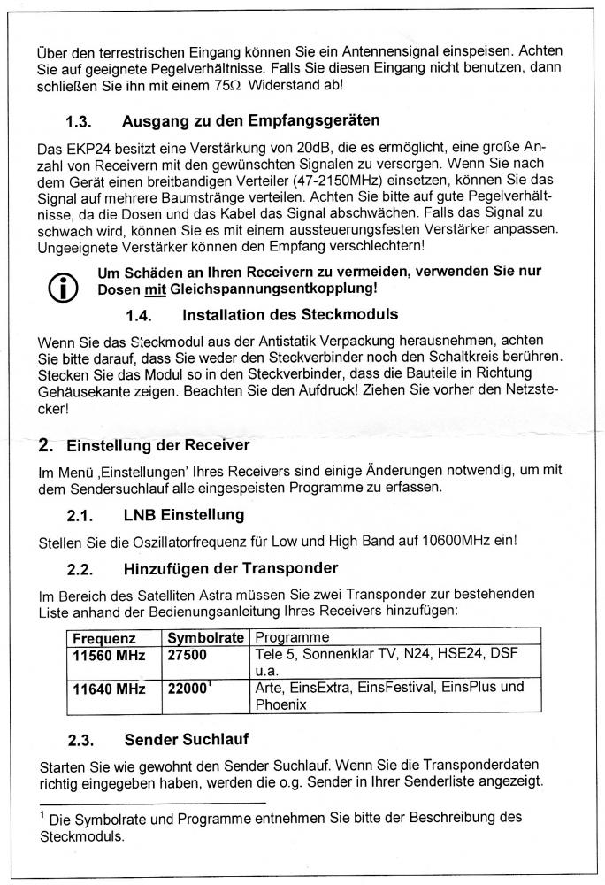 Ich habe in eine EKP24 das Steckmodul 57/17 eingesetzt . RTL ,VOX ,tele5, sport1, rtl2 werden in HD empfangen. SAT1 , pro 7 In HD nicht. Müssen noch transpondereinstellungen verändert werden?