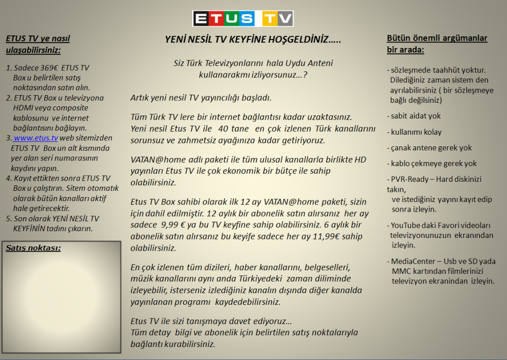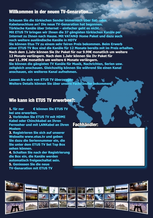 Mit ETUS TV können Sie Ihre Lieblingssender ganz ohne lästige Antenneninstallation oder lästige Kabelverlegungen empfangen. Es ist auch unwichtig ob Sie in der Ausleuchtzone des Satelliten sind oder nicht (für die East-Beam Programme von Türksat 42 Grad Ost wird tlw. eine Antenne von 125-150cm benötigt die viele nicht bauen dürfen oder einfach auf Platzmangel nicht können, von den Kosten dafür mal ganz abgesehen). Das Einzige was Sie benötigen ist eine Internetverbindung ab 2Mbit/s (=DSL 2000) die Sie an die ETUS TV- Box über LAN Kabel oder mit Hilfe eines WLAN USB-Sticks anschließen. Und Sie können sofort mit dem Fernsehspaß beginnen.