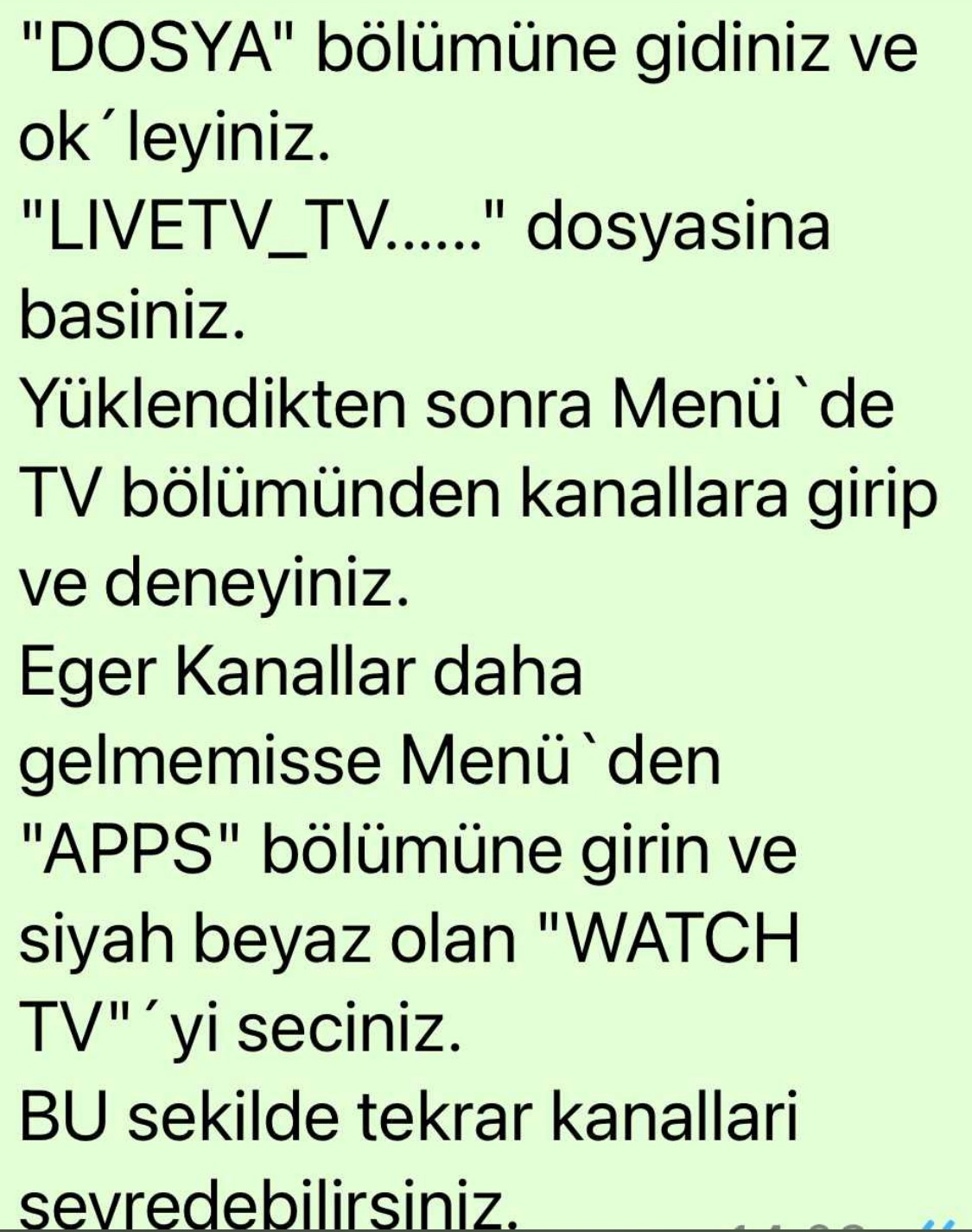 Eger Kanallar daha gelmemisse Menü`den "APPS" bölümüne girin ve siyah beyaz olan "WATCH TV"´yi seciniz.