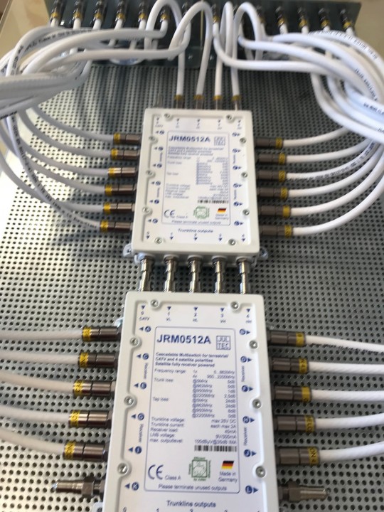 2x Jultec JRM0512A Multischalter kaskadiert hintereinander, 2x die "A" Version da hier noch die Option einer Sat>IP Erweiterung erhalten bleiben soll (dieser Router dann an die jetzt mit einem F-Endwiderstand abgeschlossenen Kaskadenausgänge vom unteren JRM0512A (dazu mehr Beiträge hier).