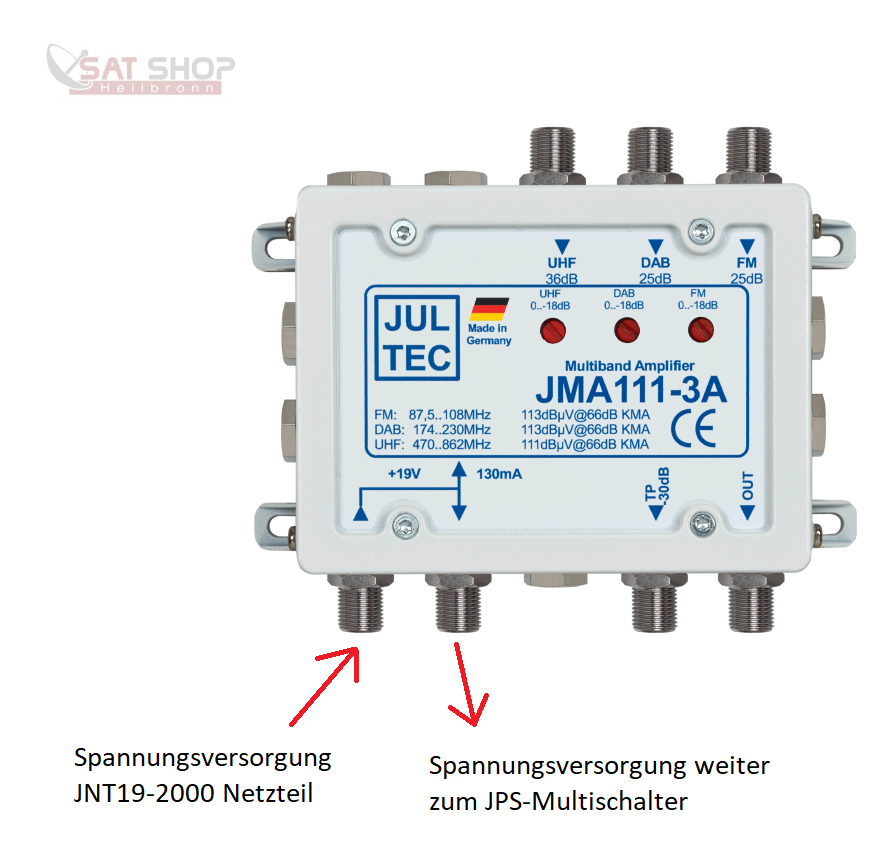 Folgend noch weiter beschrieben wird bei ihnen ein terrestrischer Verstärker fällig für DAB+, das wäre der Jultec JMA111-3A ... und der hat für die Spannungsversorgung einen Ein- und einen Ausgang welchen sie dann zum JPS-Multischalter weiter führen könnten. Es würde also ein Kabel hoch ausreichen.