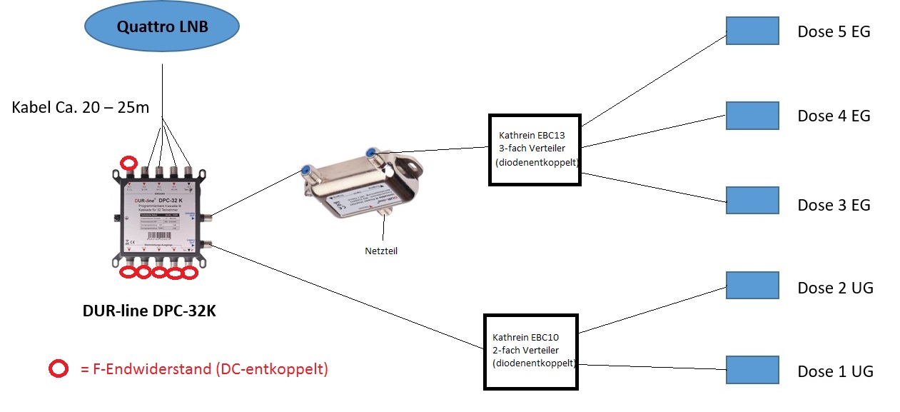 Das gibt hier kein Problem:Maghnus hat geschrieben:Ich hatte es nur so verstanden (und so auch in ihrem gepostetem Link Verkabelung Dur-Line DPC-32 K, dass die Dosen eine wichtige Rolle bei der Pegelanpassung spielt. In einem anderen Beitrag hatte ich die Info aufgeschnappt, dass eine Enddose (wenn einzige Dose im Strang) eine zu geringe Dämpfung haben und daher Durchgangsdosen mit individueller Dämpfung verwendet werden sollen.