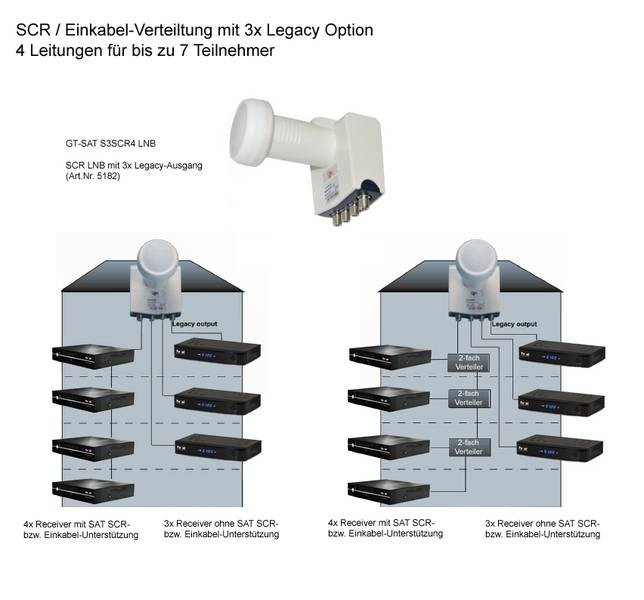 Früher habe ich gekauft diese lnb GT-SAT 3x Legacy S3SCR4 Unicable Einkabel SCR LNB 0.2dB 4x Unikabel FullHD 3D und mit diese LNB funktioniert nur Enddosen in beiden Leitung.