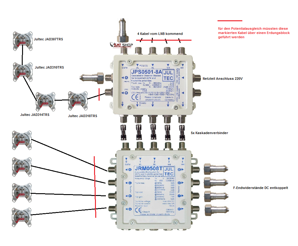 Multischalter Aufbau im Mischsystem aus Unicable-Verteilung (Reihenschaltung) incl. kaskadiertem Standard-Multischalter in Sternverteilung incl. Abschluss der offenen Ein-/Ausgänge + Potenzialausgleich