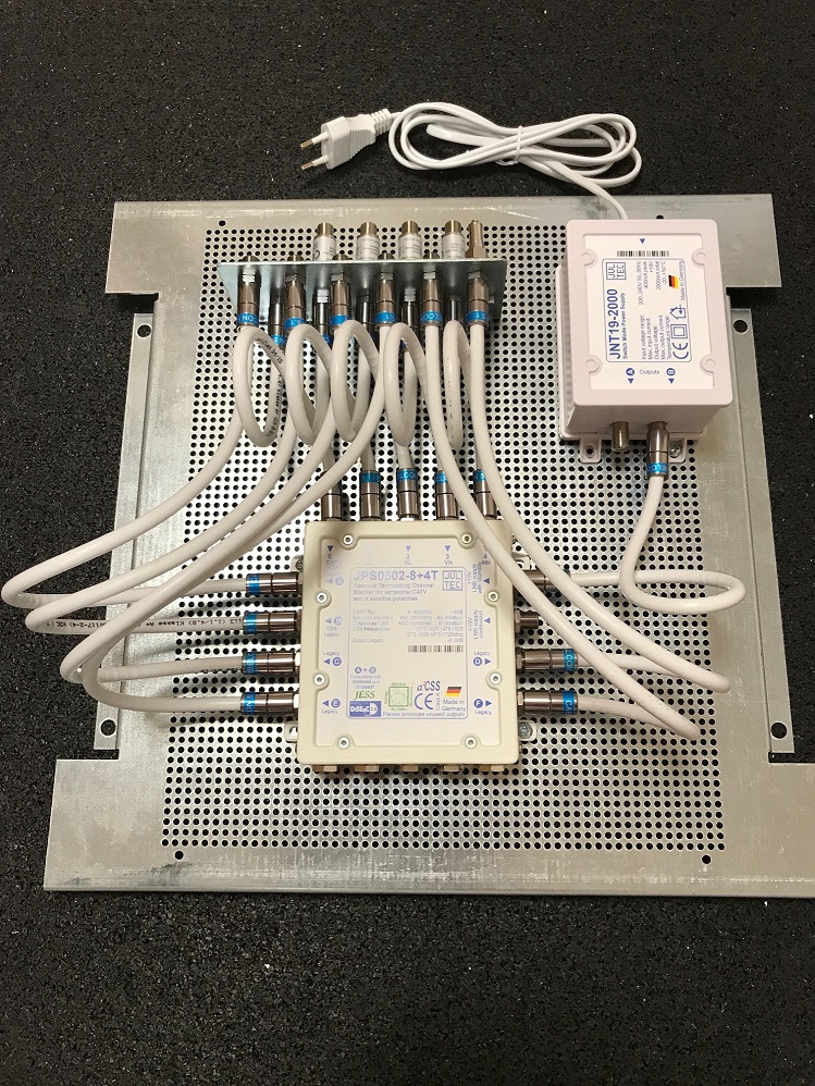 Jultec JPS0502-8+4T Unicable EN50494 / JESS EN50607 Multischalter mit 2x8 UBs + 4x Legacy-Ausgang im Voraufbau auf Lochblechplatte mit Potentialausgleich - genauer Aufbau-Plan incl. Planung dieser Anlage zu finden unter Umrüstung Einfamilienhaus Unitymedia -> Sat