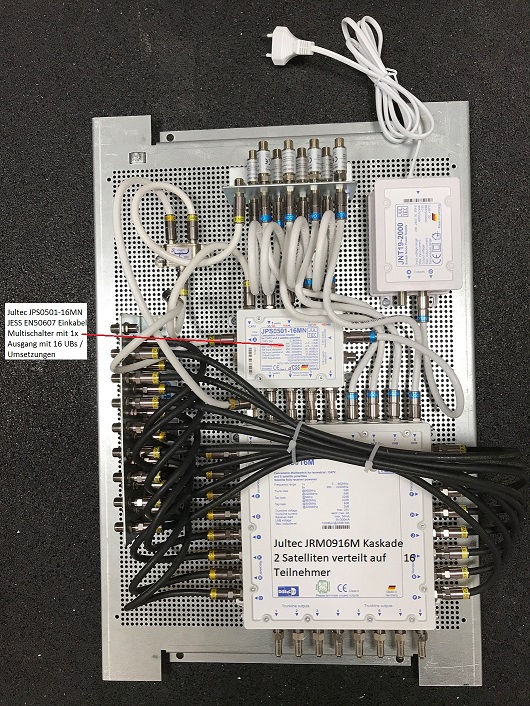 Bildname: Jultec_JRM0916M_JPS0501-16MN_Kaskadenaufbau_Legacy-Unicable_EN50494_Lochblechplattenaufbau_Potentialausgleich_terrestrische_Einspeisung _1